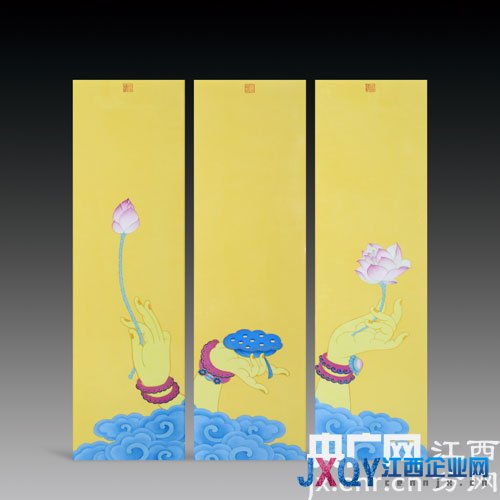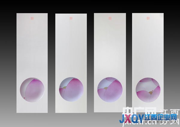 荷花很美,却无奈流光飘忽不相待,美好的东西总是瞬间即逝,周诚的瓷盘彩绘作品《绽放》便是用一组抽象的荷花形象来表现花朵从含苞到盛开的绽放过程, 把荷花生命中最精彩的一瞬“留”在了陶瓷上。