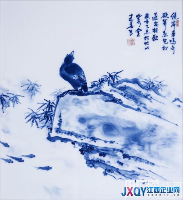 何建华的作品《清泉十里鱼儿游》,与其说浓墨勾勒的是边际,不如说显现的是经纬。画中以泼墨青花成水、分水成鱼,细致处勾线,虚渺处流釉。层层叠叠的晕染下是酣畅淋漓的水墨,作品不乏层次感,远近虚实,构图寓意,无不错落有致,相映成趣。而游鱼的出现不仅有添补右方空白的作用,更有平衡上重下轻的平衡感。设色浓而不艳,典雅清丽, 构图简明新颖,表现出一定的装饰效果,画面意境被这些流淌的青花釉料营造得飘逸、灵动。