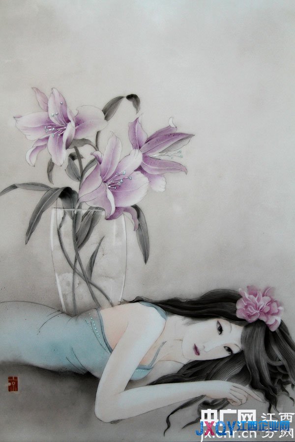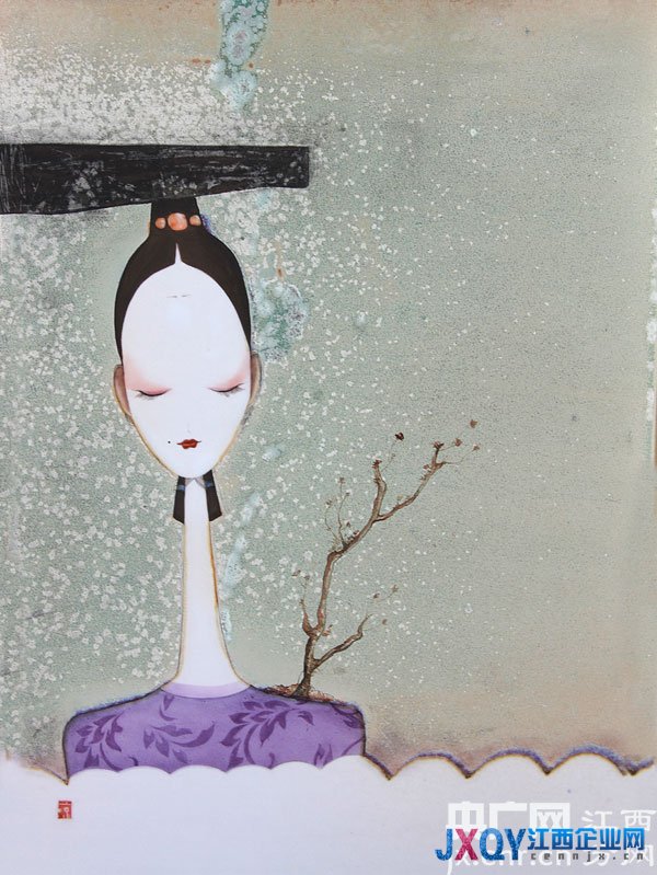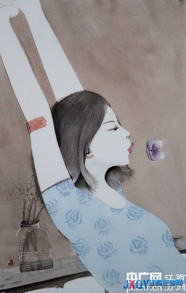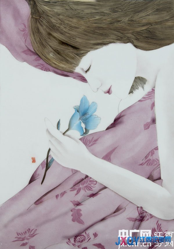 周凉凉2011年来到景德镇,她的工作室名为“瓷眸”,正是她的艺术风格的体现。慵懒的午后,安静的女子,闲适淡雅,这些是她的画中最常出现的意象。