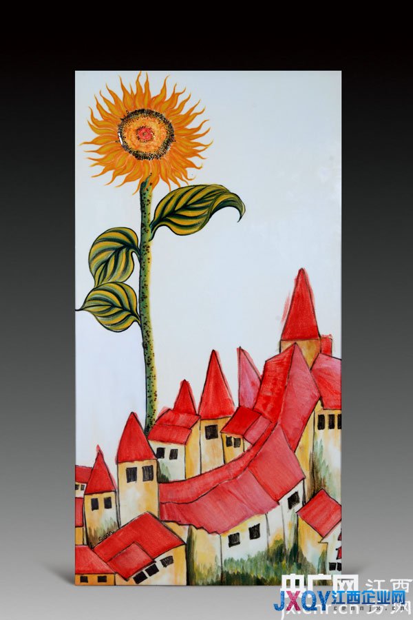 在她的向日葵系列瓷板画作品中,有一幅被苏姗列为“非卖品”的,是作者比较满意的作品之一,画面上呈现的是一排别致的乡间小屋与极其高大的向日葵——它们的个头甚至高过了小屋。这并非是荒诞的超现实主义绘画,而是取材于真实事件,英国一户人家培育出了高达8米的向日葵,其高度确实超越了自家的小别墅。苏姗认为这件事充分体现出向日葵的生命本质,那就是对光明的向往与追逐,那是一股令人钦佩的向阳的力量。