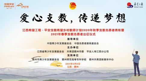 江西企业网讯 2021年3月5日,江西希望工程•平安支教志愿者行动2020秋季支教志愿者表彰仪式暨2021年春季支教志愿者出征仪式于赣州师范高等专科学校顺利举办,该项目由平安人寿江西分公司联合江西省青少年发展基金会、共青团赣州市委共同开展,旨在向赣州36所乡村小学输送师资力量,助力学校教学水平提升和师资能力建设。